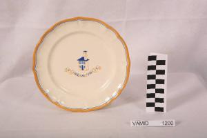 Piatto da frutta circolare con tesa ondulata e bordo leggermente arcuato e modellato con una profilatura incisa; di colore bianco avorio con disegno sul fondo nei colori giallo carico e blu raffigurante una casa con lungo comignolo e un cartiglio sottostante con iscrizione; tesa bordata di giallo carico e profilatura in blu.