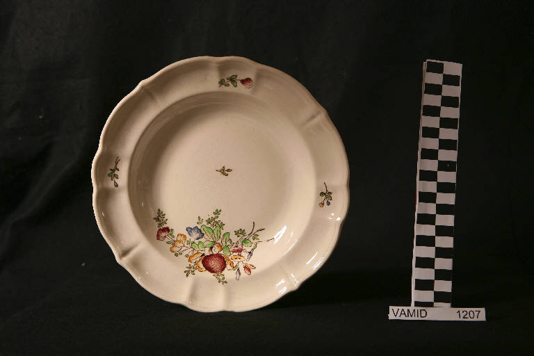 Piatto fondo circolare con tesa ondulata e bordo leggermente arcuato e modellato con una profilatura incisa; fondo bianco avorio con mazzo di fiori policromo in posizione decentrata sul fondo e piccoli tralci fioriti lungo la tesa.