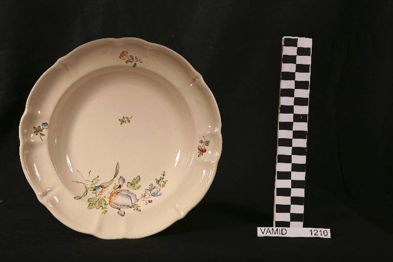 Piatto fondo circolare con tesa ondulata e bordo leggermente arcuato e modellato con una profilatura incisa; fondo bianco avorio con mazzo di fiori policromo in posizione decentrata sul fondo e piccoli tralci fioriti lungo la tesa.