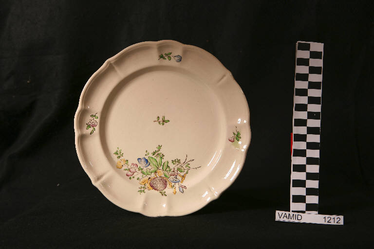 Piatto piano circolare con tesa ondulata e bordo leggermente arcuato e modellato con una profilatura incisa; fondo bianco avorio con mazzo di fiori policromo in posizione decentrata sul fondo e piccoli tralci fioriti lungo la tesa.