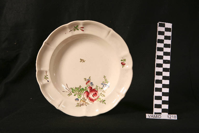 Piatto fondo circolare con tesa ondulata e bordo leggermente arcuato e modellato con una profilatura incisa; fondo bianco avorio con mazzo di fiori policromo in posizione decentrata sul fondo e piccoli tralci fioriti lungo la tesa.