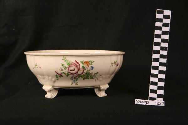 Insalatiera di forma ovale con quattro piedini a volute a "C" con motivi vegetali; corpo sagomato con motivi a ventagli a rilievo sopra l'attacco dei piedini; fondo bianco avorio con mazzi di fiori policromi sulle due facce principali del recipiente; piccoli tralci fioriti variamente disposti.