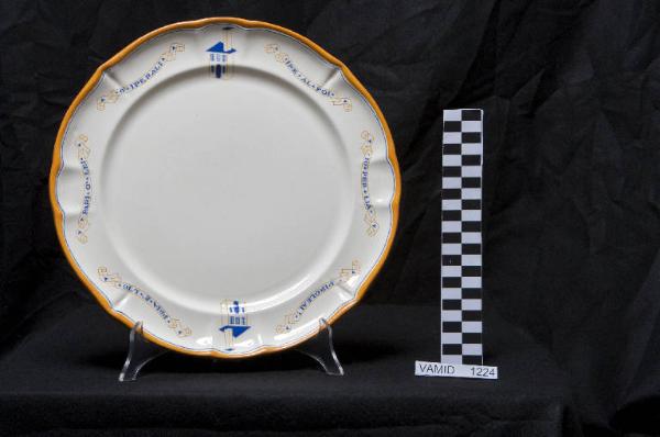 Piatto da portata circolare con tesa ondulata e bordo leggermente arcuato e modellato con una profilatura incisa; di colore bianco avorio con disegno sulla tesa nei colori giallo carico e blu raffigurante una casa con lungo comignolo ripetuto due volte e vari cartigli con iscrizioni; tesa bordata di giallo carico e profilatura in blu.