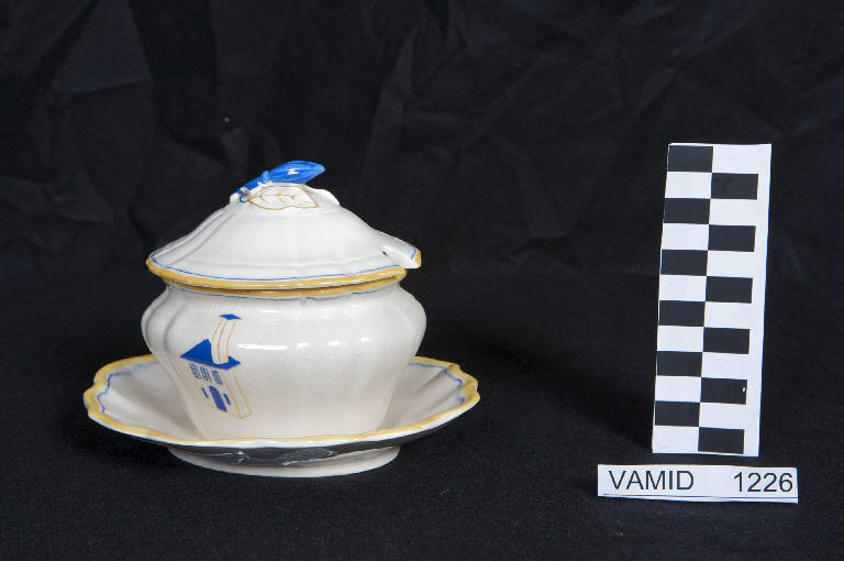 Formaggera a sezione circolare mistilinea fissata a piattino ovale con bordo ondulato; recipiente con corpo sagomato, estroflesso nella parte superiore, con restringimento per l'appoggio del coperchio; coperchio a cono irregolare, leggermente ondulato, apertura per il cucchiaio e frutto apicale con funzione di presa; colore bianco avorio con disegno di una casa con lungo comignolo nei colori giallo intenso e blu, assenti le caratteristiche iscrizioni; bordi rifiniti in giallo e blu.
