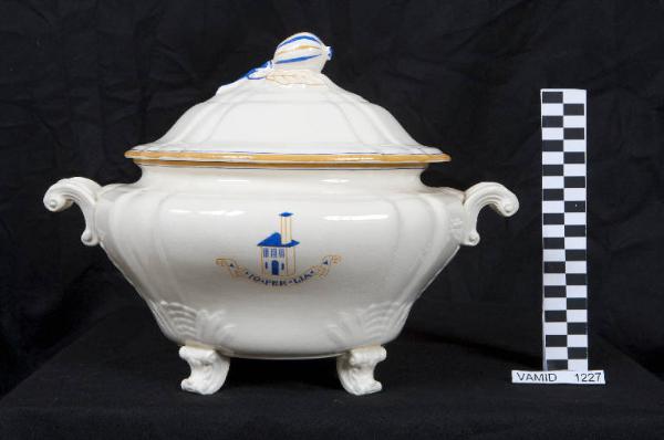 - NOTIZIE STORICO CRITICHE La zuppiera fa parte di un servizio da tavola composto di undici piatti da frutta, quindici piatti piani, sette piatti fondi, due piatti da portata, una salsiera, una formaggera, una zuppiera e una insalatiera (inv. nn. 1195-1205, 1223-1237, 1239-1249, 1258). Il servizio è realizzato nella forma Vecchia Milano con decoro ideato dall'architetto milanese Piero Portaluppi in omaggio alla moglia Lia Baglia, sposata nel 1913. Il servizio, denominato "Piero e Lia", presenta infatti il disegno di una casa, simbolo della famiglia e del focolare e anche dell'attività di architetto del Portaluppi, e un cartiglio con sei iscrizioni diverse, tutte anagrammi di "Piero e Lia", che si alternano sui vari oggetti. Gli anagrammi ("Pria e l'io", "Piroleai!", "Io per Lia", "Ire al poi", "Pari o' lei", "O' iperali") sono talvolta licenze poetiche, quasi dei 'non sense', ma proprio per questo introducono a un mondo privato e amorevole fatto di un'intesa esclusiva, e in questo sta il fascino di questa invenzione di Portaluppi. L'architetto fu spesso attivo per Laveno-Mombello, ma soprattutto negli anni venti, quando eseguì uno studio per un albergo (1922), il villino per il direttore della Società Ceramica Italiana (1923), il Parco della Rimembranza, lo Stabilimento della Società Ceramica Italiana in via Buozzi (1924-1926), il progetto per lo stabilimento Verbano in via XXV aprile (1924) e il progetto per l'ampliamento del cimitero (1925).\nFigura poliedrica, attiva anche nei campi del disegno, della vignetta e del design, il Portaluppi si cimentò nella progettazione di ceramiche per la S.C.I. (di cui fu anche il direttore artistico) come il superbo vaso in blu cobalto con decori in oro del 1923 (in. nn. 1861-1862) tuttora conservato in una sala del museo e in questo originalissimo servizio, databile ancora agli anni venti. Proprio in quegli anni Portaluppi manifestò in un'altra occasione il gusto per gli anagrammi: nel 1926, incaricato del Piano Regolatore di Milano insieme a Marco Semenza, chiamò il Piano "Ciò per amor" dal nome di entrambi.