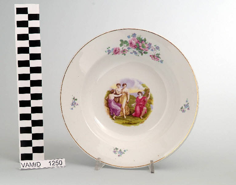 - NOTIZIE STORICO CRITICHE Il piatto, realizzato dalla Società Ceramica Italiano nel 1925 come attestano sia l'etichetta applicata sia il marchio a impressione, rispecchia una tipologia decorativa molto nota, riproducente scene mitologiche e idilli amorosi tratti da raffigurazioni dalla pittrice Angelica Kauffmann. Queste scene, ampiamente utilizzate mediante decalcomania dalla SCI, furono riprodotte su ceramica già nel XIX secolo, come attestano alcuni stoviglie realizzate dalla ditta Carnelli, Caspani e Revelli di Laveno.