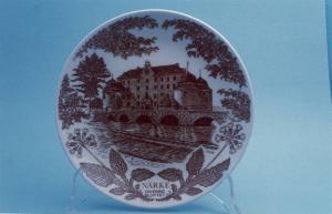 - NOTIZIE STORICO CRITICHE Si tratta di un piatto commemorativo, realizzato forse per qualche ricorrenza collegata alla lunga storia del castello di Orebro nella regione dei laghi in Svezia. L'opera è piacevolmente decorata dall'artista svedese Sven Jonson che ha riprodotto una delle vedute più note della costruzione all'interno di una originale incorniciatura di fiori e foglie analiticamente descritti. Il piatto è all'interno di una serie eseguita in anni diversi e con soggetti diversi, di cui sono conservati al MIDC alcuni esemplari (cfr. inv. nn. 1269, 1270, 1271, 1289).