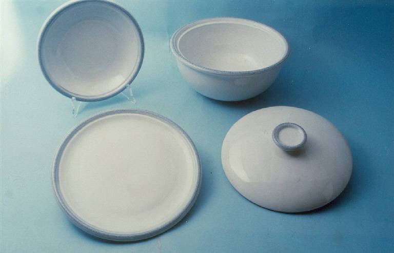 - NOTIZIE STORICO CRITICHE Il piatto, appartenente a un servizio da tavola composto da un piatto fondo, un piatto piano e una zuppiera (inv. nn. 1267, 1285, 1286), si lega tipologicamente a un servizio da thè (cfr. inv. nn. 1132, 1151-1152) e ad una tazza da caffè (cfr. num inv. 1556) conservati al Museo delle Terraglie di Laveno. La rifinitura in smalto azzurro stesa in modo irregolare sui bordi conferisce un richiamo al vasellame "d'altri tempi". La datazione agli anni '70-'80 del Novecento è confermata dal marchio presente sulla teiera num. inv. 1151che è stato utilizzato dalla Richard Ginori dal 1950 al 1980.