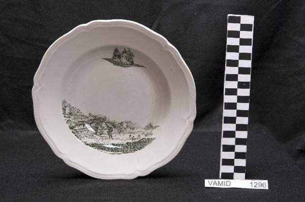 Piatto fondo con orlo sagomato a rilievo; fondo bianco avorio con scena di battaglia in paesaggio marino in posizione decentrata in verde.