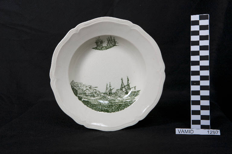 Piatto fondo con orlo sagomato a rilievo; fondo bianco avorio con scena di battaglia in paesaggio marino in posizione decentrata in verde.