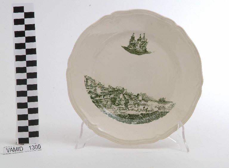 Piatto piano con orlo sagomato a rilievo; fondo bianco avorio con scena di battaglia in paesaggio marino in posizione decentrata in verde.