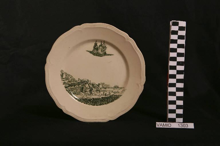 Piatto piano con orlo sagomato a rilievo; fondo bianco avorio con scena di battaglia in paesaggio marino in posizione decentrata in verde.