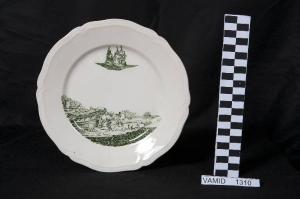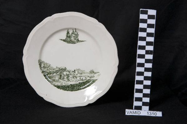 Piatto piano con orlo sagomato a rilievo; fondo bianco avorio con scena di battaglia in paesaggio marino in posizione decentrata in verde.