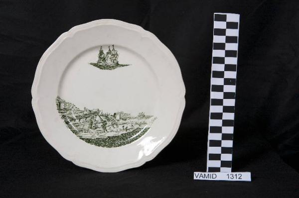 Piatto piano con orlo sagomato a rilievo; fondo bianco avorio con scena di battaglia in paesaggio marino in posizione decentrata in verde.