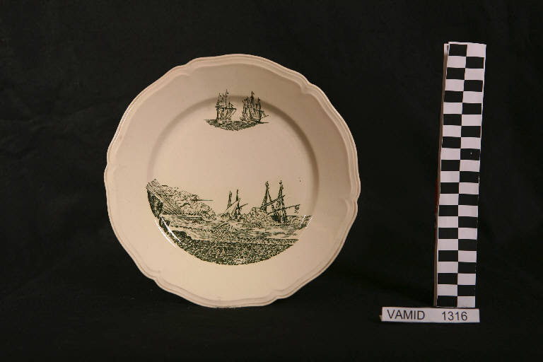 Piatto piano con orlo sagomato a rilievo; fondo bianco avorio con scena di battaglia in paesaggio marino in posizione decentrata in verde.