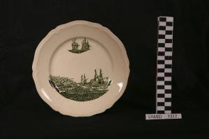 Piatto piano con orlo sagomato a rilievo; fondo bianco avorio con scena di battaglia in paesaggio marino in posizione decentrata in verde.