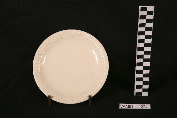 Piattino smaltato avorio di forma circolare; decorato con motivo geometrico a rilievo sulla tesa.