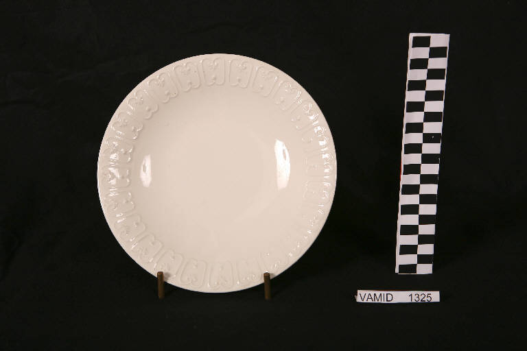 Piatto fondo smaltato avorio di forma circolare; decorato con motivo vegetale stilizzato a rilievo sulla tesa.