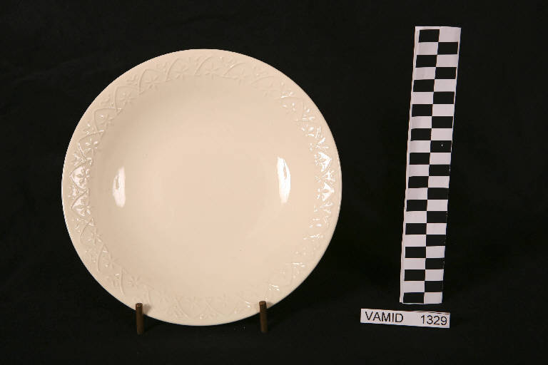 Piatto fondo smaltato avorio di forma circolare; decorato con motivo geometrico e vegetale stilizzato a rilievo sulla tesa.