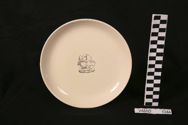 Piatto piano di forma circolare decorato al centro da paesaggio marino in monocromo color nero.