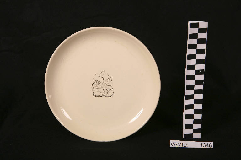 Piatto piano di forma circolare decorato al centro da paesaggio marino in monocromo color nero.