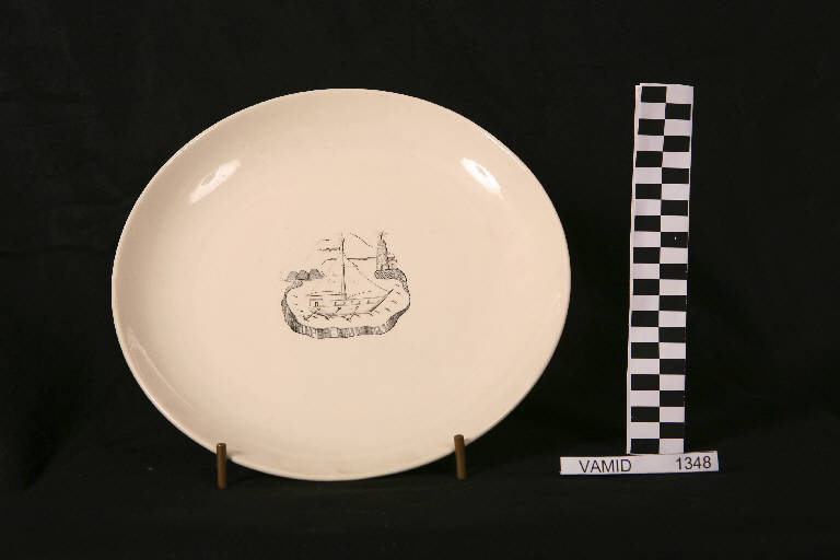 Piatto piano di forma circolare decorato al centro da paesaggio marino in monocromo color nero.