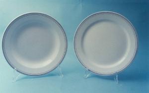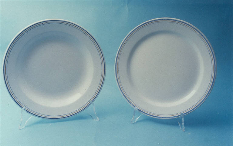 Piatto piano con tesa piatta; colore bianco con filettatura lungo il bordo in blu e rosso.