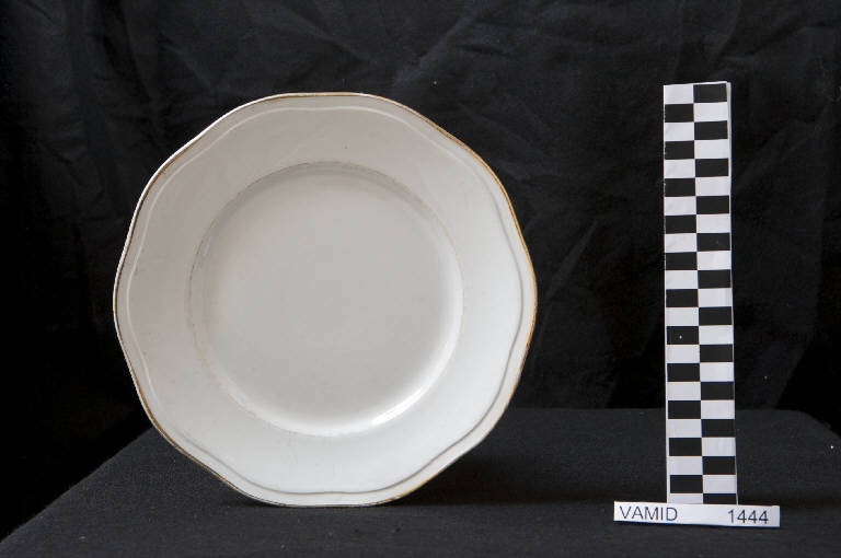 Piatto da frutta con orlo ondulato; fondo bianco; bordo rifinito con filettatura oro.