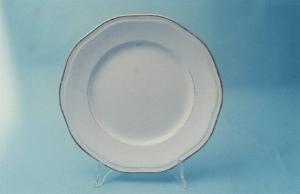 Piatto da frutta con orlo ondulato; fondo bianco; bordo rifinito con filettatura oro.