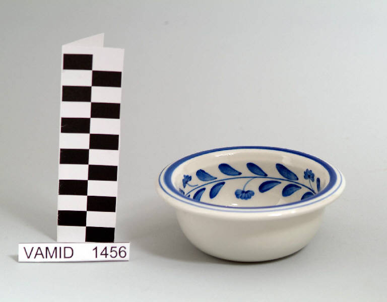 Pirofila a sezione circolare; bordo estroflesso; fondo bianco con motivo decorativo vegetale a ghirlanda in blu all'interno; bordo rifinito in blu.