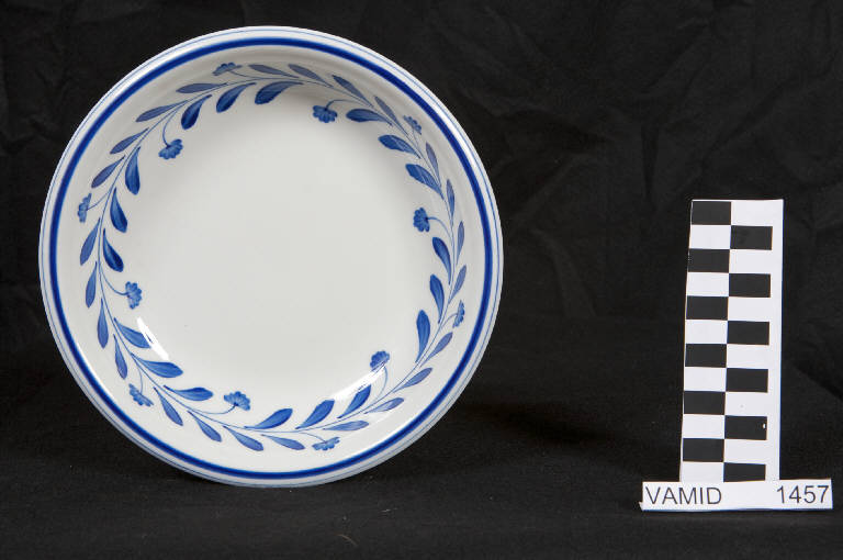 Pirofila a sezione circolare; bordo estroflesso; fondo bianco con motivo decorativo vegetale a ghirlanda in blu all'interno; bordo rifinito in blu.