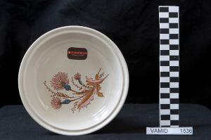 Piatto fondo circolare senza tesa con bordo rialzato; fondo bianco avorio con motivo floreale stilizzato policromo in posizione decentrata sul fondo.