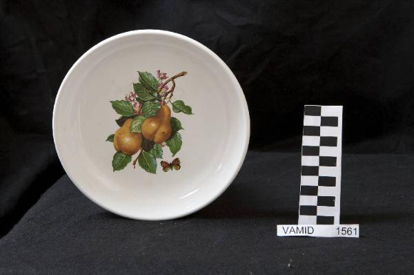 Piatto fondo di forma circolare; fondo di colore bianco con motivo a carattere vegetale (tralcio di pere con fiori e foglie) e animale (farfalla) realizzato in decalcomania policroma.