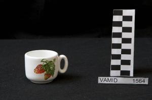 Tazza da caffè con basso corpo cilindrico; manico ovale; fondo color bianco con motivo a carattere vegetale (fragole con foglie) realizzato in decalcomania policroma.