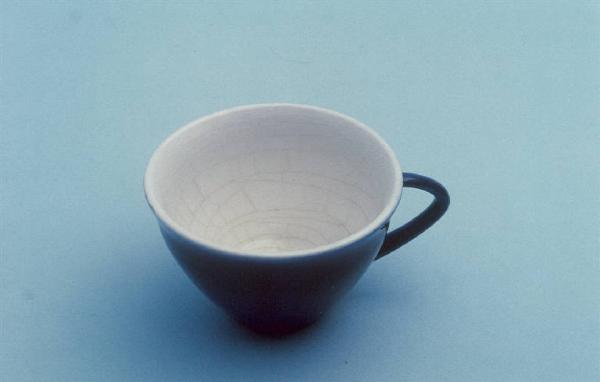 Tazza da thè con corpo leggermente svasato; restringimento in prossimità del piede; manico dalla foggia leggermente appuntita; fondo blu cobalto; bianco internamente.