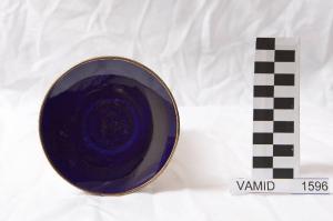 Piattino circolare; fondo blu cobalto; bordo rifinito con filettatura oro.
