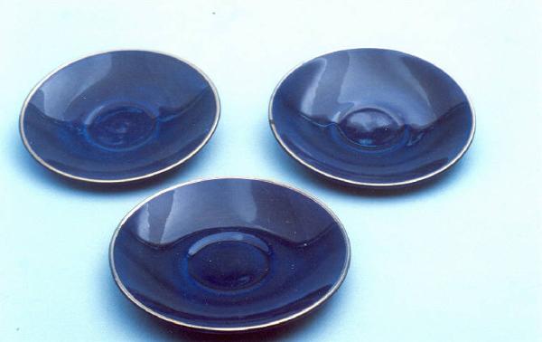 Piattino circolare; fondo blu cobalto; bordo rifinito con filettatura oro.