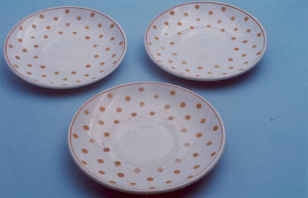 Piattino circolare; fondo bianco decorato con motivo a pois color arancio; bordo rifinito con filettatura arancio.