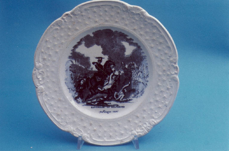 Piatto piano con orlo ondulato; tesa con motivi vegetali e bordura a merletto a rilievo; fondo bianco avorio con scena della battaglia di Solferino nel cavetto.