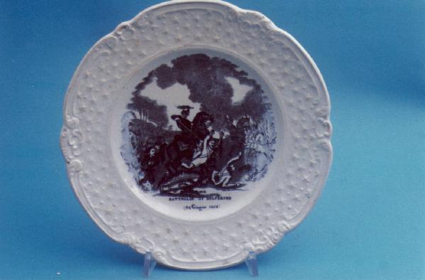 - NOTIZIE STORICO CRITICHE Il piatto in esame, facente parte di un servizio da dodici (nn. inv. 1616-1627), è stato prodotto dalla Richard indicativamente tra gli anni '60 e '70 dell'Ottocento. La formula completa del marchio a tergo, oggi solo parzialmente leggibile, è "RICHARD SON BARONA". Secondo il Morazzoni (cfr. "La terraglia italiana", 1956 ?) questo marchio venne impresso solo fino al 1848. Le scene nei cavetti, raffiguranti episodi della storia italiana avvenuti tra il 1859 e il 1860, sono evidentemente più tarde: la presenza di una di esse in un piatto prodotto dalla Richard tra il 1859 e 1870 nello stabilimento di San Cristoforo (cfr. "La terraglia italiana", p. 148) confermerebbe una datazione coeva. E' quindi possibile che nello stabilimento di Barona, una località vicino Milano, sia rimasta una giacenza di piatti poi ripresi e dipinti tra gli anni '60 e '70. Nel cavetto del piatto in esame è raffigurata, attraverso la tecnica della decalcomania sottosmalto in monocromo color nero, la battaglia di Solferino. Lo scontro, combattuto tra l'esercito austriaco e quello franco-sardo il 24 giugno 1859, segnò la fine della Seconda Guerra di Indipendenza Italiana.