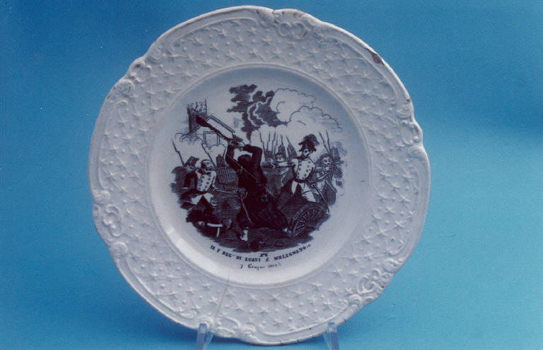 - NOTIZIE STORICO CRITICHE Il piatto in esame, facente parte di un servizio da dodici (nn. inv. 1616-1627), è stato prodotto dalla Richard indicativamente tra gli anni '60 e '70 dell'Ottocento. La formula completa del punzone a tergo, oggi solo parzialmente leggibile, è "RICHARD SON BARONA". Secondo il Morazzoni (cfr. "La terraglia italiana", 1956 ?) questo marchio venne impresso solo fino al 1848. Le scene nei cavetti, raffiguranti episodi della storia italiana avvenuti tra il 1859 e il 1860, sono evidentemente più tarde: la presenza di una di esse in un piatto prodotto dalla Richard tra il 1859 e 1870 nello stabilimento di San Cristoforo (cfr. "La terraglia italiana", p. 148) ipotizza una datazione coeva. E' quindi possibile che nello stabilimento di Barona, una località vicino Milano, sia rimasta una giacenza di piatti poi ripresi e dipinti tra gli anni '60 e '70. Nel cavetto del piatto in esame è raffigurata, attraverso la tecnica della decalcomania sottosmalto in monocromo color nero, il primo reggimento degli Zuavi (corpo francese) a Melegnano.