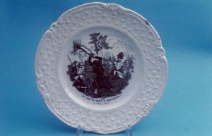 Piatto piano con orlo ondulato; tesa con motivi vegetali e bordura a merletto a rilievo; fondo bianco avorio con scena raffigurante il primo reggimento degli zuavi a Melegnano nel cavetto.