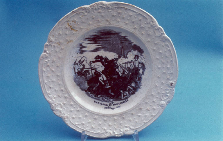 - NOTIZIE STORICO CRITICHE Il piatto in esame, facente parte di un servizio da dodici (nn. inv. 1616-1627), è stato prodotto dalla Richard indicativamente tra gli anni '60 e '70 dell'Ottocento. La formula completa del punzone a tergo, oggi solo parzialmente leggibile, è "RICHARD SON BARONA". Secondo il Morazzoni (cfr. "La terraglia italiana", 1956 ?) questo marchio venne impresso solo fino al 1848. Le scene nei cavetti, raffiguranti episodi della storia italiana avvenuti tra il 1859 e il 1860, sono evidentemente più tarde: la presenza di una di esse in un piatto prodotto dalla Richard tra il 1859 e 1870 nello stabilimento di San Cristoforo (cfr. "La terraglia italiana", p. 148) ipotizza una datazione coeva. E' quindi possibile che nello stabilimento di Barona, una località vicino Milano, sia rimasta una giacenza di piatti poi ripresi e dipinti tra gli anni '60 e '70. Nel cavetto del piatto in esame è raffigurata, attraverso la tecnica della decalcomania sottosmalto in monocromo color nero, la battaglia di Montebello avvenuta il 20 maggio 1859. Alla fine del conflitto le truppe austriache del generale Gyulai furono sconfitte da quelle franco-piemontesi.