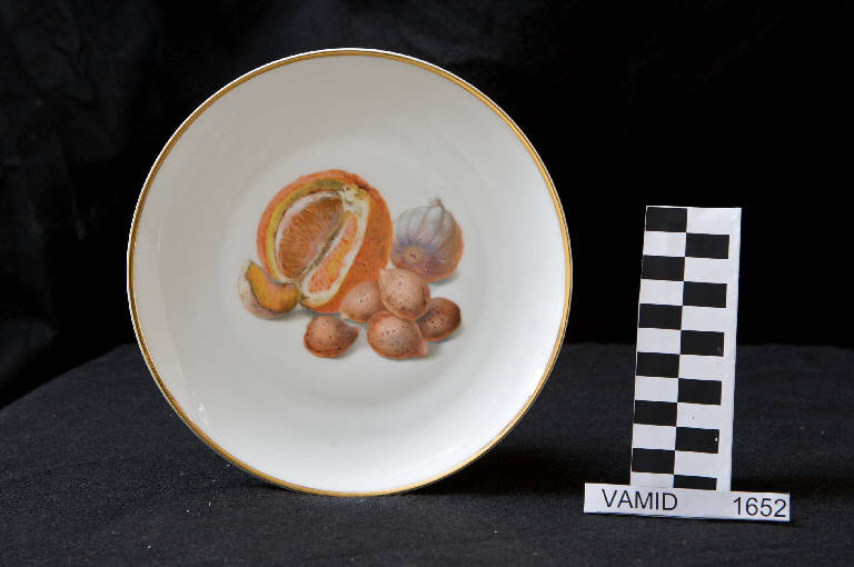 Piatto da frutta circolare; fondo bianco con arancia e mandorle in marrone e arancio nel centro del cavetto; bordo rifinito con filettatura oro.