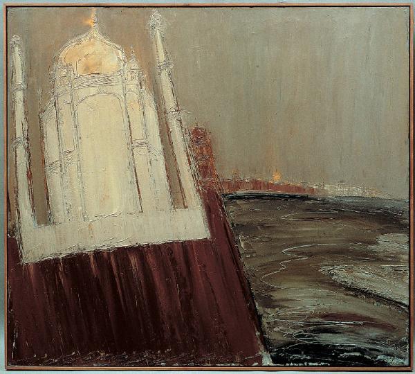 - NOTIZIE STORICO CRITICHE Al ritorno dal suo viaggio in India Congdon si cimentò in diverse versioni del soggetto, anche se dovrà confessare il proprio scacco di fronte alla sovraumana perfezione del monumento. Dalle precedenti versioni si distingue nettamente "Taj Mahal, 3", di dimensioni decisamente più imponenti. In effetti, l'artista non vi ha posto il monumento al centro, isolato sullo sfondo del cielo. Piuttosto lo ha fissato da uno degli accessi laterali, in modo da includere un'ampia veduta del fiume retrostante. L'edificio, decentrato, fa spazio al contesto paesaggistico con un audace contrasto di piani che sembra spaccare in due la composizione: a sinistra, in primo piano, la sagoma candida e fortemente allungata forma con il bruno basamento della terrazza un'unica massa obliqua che attraversa verticalmente la superficie del dipinto, quasi a fuoriuscirne; a destra, lo sguardo spazia su una vasta pianura, sul fiume, fino all'orizzonte dove è visibile la striscia sottile della città di Agra.
