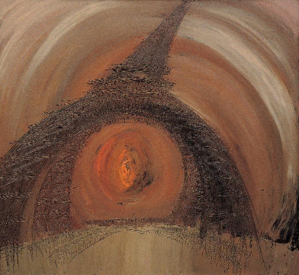 - NOTIZIE STORICO CRITICHE "Eiffel Tower, 1" venne dipinta a Positano nel febbraio del '59. Il confronto con "Positano 6", eseguito nelle stesse settimane, attesta i tormentosi andirivieni del linguaggio congdoniano in una fase particolarmente critica di sviluppo. L'immagine della torre si differenzia nettamente dalle versioni del '55: in questa abbiamo una contaminazione tra una veduta frontale e una veduta di sottinsù del grande manufatto. Di conseguenza la prima rampa incombe gigantesca, mentre la parte superiore si assottiglia in un ardito scorcio. La generale curvatura dello spazio permette di condensare all'interno del pannello rettangolare la dilatazione laterale della prima e lo slancio verticale della seconda. Colpiscono l'ampiezza del dipinto, la sua tonalità affocata e corrusca e l'andamento rotatorio delle spatolate che sembra generarsi a partire dal nucleo color arancione, ipnotico come un occhio, incorniciato dalle iperboliche arcate della Tour Eiffel.