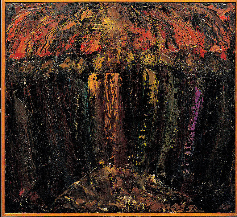 - NOTIZIE STORICO CRITICHE Verso la fine di maggio Congdon lavora intensamente sul soggetto della "Pentecoste", di cui sono documentate almeno sei versioni. E' verosimile che il "4" sia stato eseguito negli stessi giorni in cui venne prodotta la serie dei "Subiaco". In effetti non è difficile riconoscere notevoli analogie con "Subiaco 4", per lo meno dal punto di vista della esecuzione pittorica: si considerino in questo senso le tinte piuttoste accese e le spatolate alquanto sommarie, nervose e sfrangiate. Emerge soprattutto il forte contrasto tra il fondo di smalto nero e le macchie di vivaci colori, i cui forti bagliori si trasformano in un vero e proprio incendio nelle fiammelle rosse della parte superiore. Le tredici figure (gli apostoli e, presumibilmente, la Madra di Gesù) formano un vasto anfiteatro, simili ad altrettante colonne su cui posa o si innalza una sorta di rosso padiglione. Siamo ormai molto vicini a una totale contaminazione-fusione di figura e architettura e l'evento storico della discesa dello Spirito sugli apostoli è "misticamente" identificato con lo spazio della chiesa, nella duplice accezione di comunità e di tempio che la accoglie.