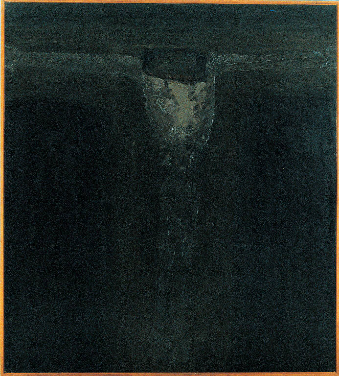 - NOTIZIE STORICO CRITICHE L'opera è basata su gradazioni minime di toni molto scuri: pertanto la figura del Cristo appena si intravede sul fondo quasi altrettanto scuro. Braccia e gambe - legnose estremità da manichino - seguono rigidamente gli assi, verticale e orizzontale, del quadro. Una fascia di luce, una sorta di "alone", incornicia il corpo del Crocefisso, quasi riecheggiandone la forma e stabilendo una sorta di mediazione tra figura e fondo nero. Il punto di maggior chiarore si viene a concentrare nel busto, immediatamente sotto il capo, il cui ovale approssimativo è completamente ruotato sull'orizzontale - così da perdere ogni verosimiglianza anatomica: nero, di un nero paragonabile solo a quello del fondo, al punto di sembrare un mostruoso buco, esso collide violentemente con la lumiscenza del petto. Ne scaturisce una reciproca esaltazione, con il risultato paradossale che la testa scura sembra sporgersi in avanti: come un corpo che venga a frapporsi tra noi e il cupo fiammeggiare del petto.
