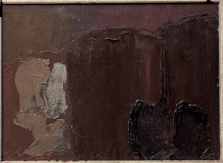 - NOTIZIE STORICO CRITICHE Verso metà degli anni '60, con l'esaurirsi del filone liturgico, Congdon dipinge, oltre che i paesaggi sublacensi, anche diverse vedute assisane, in particolare le facciate di case addossate le une alle altre nel quartiere di san Pietro, sede del primo studio dell'artista nella città umbra. Il confronto con l'analogo tema delle facciate di case della Bowery newyorkese del '48 permette di misurare l'evoluzione del linguaggio pittorico di Congdon.\nSi tratta, inizialmente, di dipinti di piccolo formato, dall'impianto molto essenziale, interamente basato sulle giustapposizione di masse di colore, non più animate dall'incisione del punteruolo. In questo contesto si colloca la sotto-serie degli Asisisi case nebbia, eseguita tra la fine di novembre e i primi di dicembre 1966. Assisi case nebbia, 5 esibisce il medesimo impianto di Assisi case, 5: le masse delle facciate mute, il cui profilo si staglia contro il cielo della medesima tonalità. E' piuttosto il modellato della spatola a marcare le forme, con una gradazione di spessori che richiama la tecnica del basso-rilievo: le due masse scure e dense degli alberi in primo piano, poi lo stato più sottile delle facciate, i cui toni trapassano da un viola molto scuro a un rosato via via più chiaro, con la macchia biancastra che fa contrasto, come l'improvvisa accensione di una luce, come in Assisi case, 5.