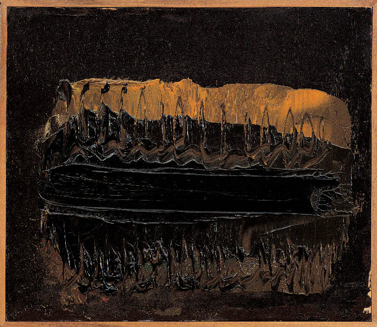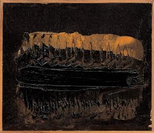 - NOTIZIE STORICO CRITICHE In quest'opera di piccolissime dimensioni, viene riproposto, elaborato, il tema della nave che, come già avvertito, informa trasversalmente l'intera vita di Congdon. Su di uno sfondo nero (ancora il buio dell'India) assistiamo all'apparizione di una luce emanata dalla nave, di un bagliore che si sdoppia e si riflette nell'oscurità delle acque, creando un gioco di rifrazioni che, grazie a quella decisa e densa spatolata nera che unifica e sorregge l'intera composizione, non smembrano e frammentano l'organicità del soggetto.